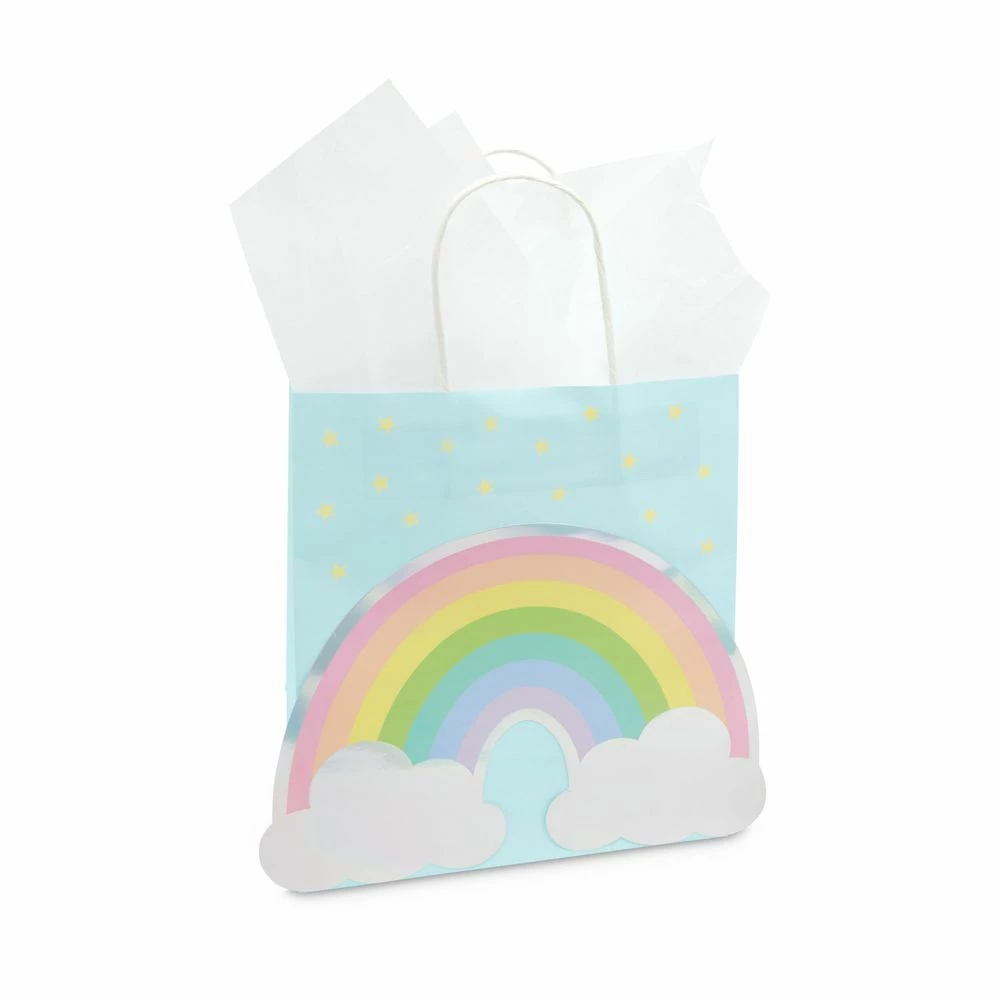 - Pastel Rainbow Gift Bags: This set of 15 holographic rainbow gift bags feature lovely pastel colors and comes with 20 sheets of white tissue paper