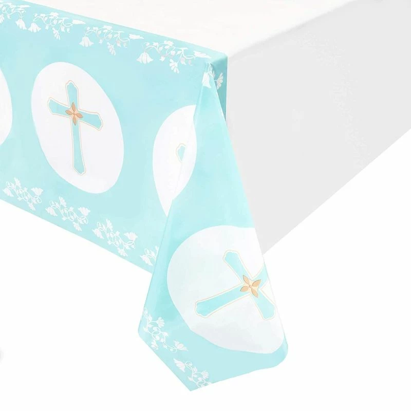 - EASY PARTY PREP & DECOR: Don’t make decorating harder than it should be, complete your party decor with these religious themed table covers and celebrate in style. The light blue background with cross accents will definitely add an elegant touch to dining tables