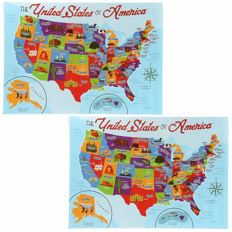 - What’s Included: Set of 2 USA maps for kids featuring brightly colored designs. Dimensions: 24 x 17 inches