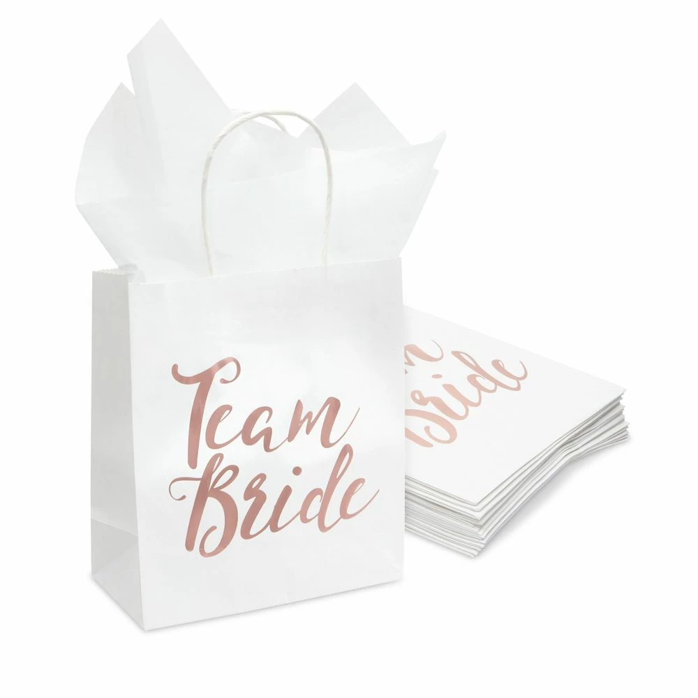 Bridesmaid Gift Bag 15 Pack Team Bride White Paper Bag, Bridal Party Bags Includes Tissue Paper, Rose Gold Foil, 8 x 4 x 9 inches