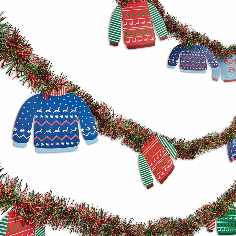 Add this decorative Garland to stairways, doors, lamp posts, windows or walls. The length of this garland makes it perfect to cover several spots in your home or one really long wall The ugly sweater theme will give your party a festive and fun theme Perfect for home and office parties. Dimensions: Total garland length 26.25 feet inches; each sweater cut-out 6.4 x 5 inches.