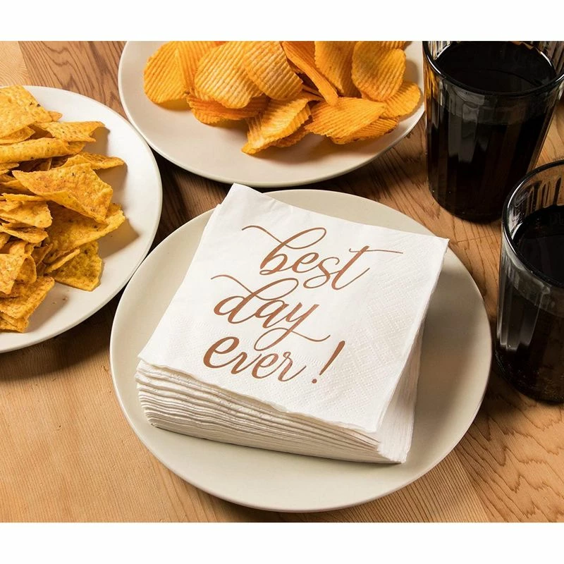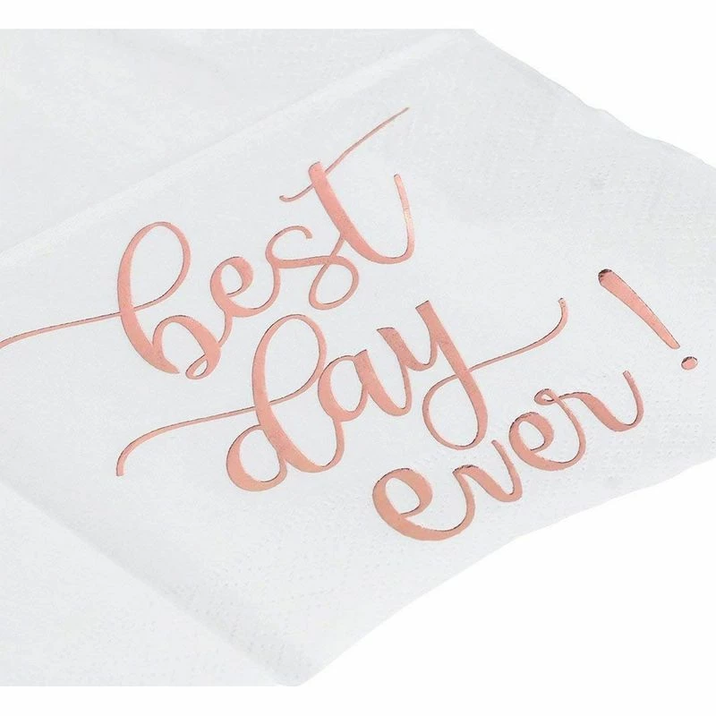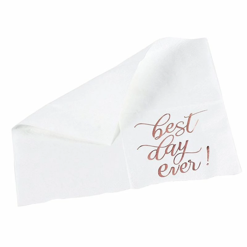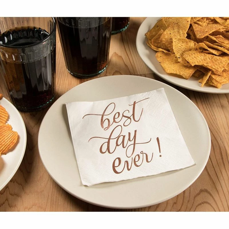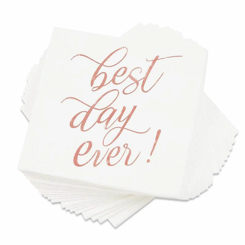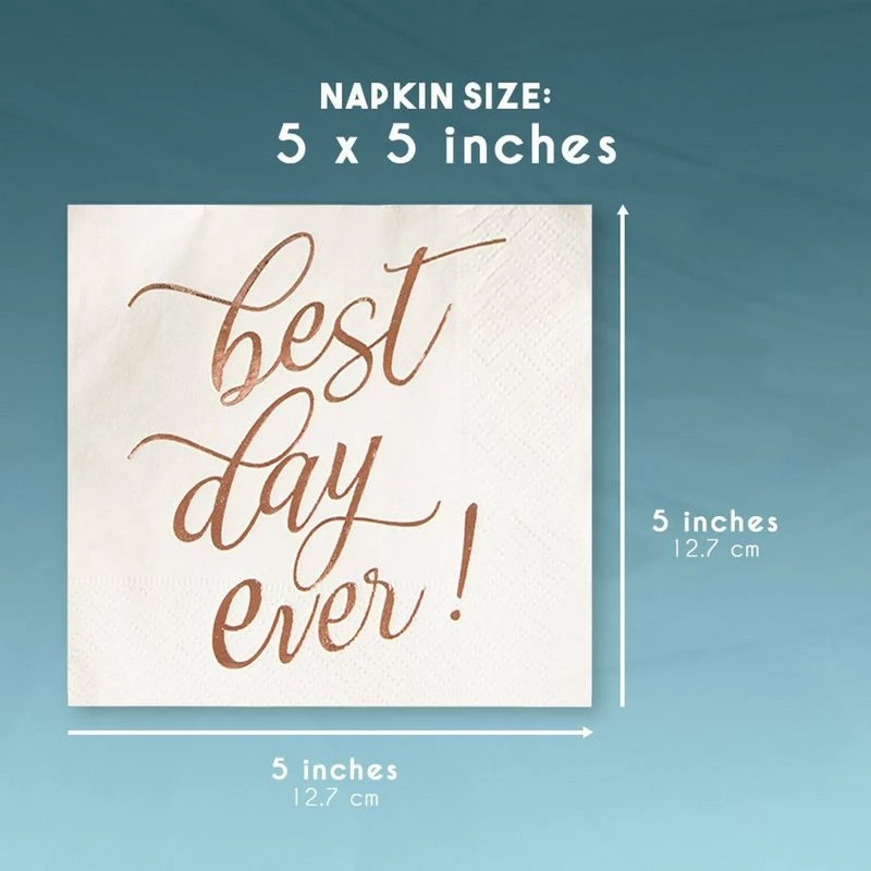- Wedding Party Decorations: Featuring rose gold letters that read “Best Day Ever”, these napkins are sure to compliment your wedding, bridal shower, and engagement party supplies and tableware