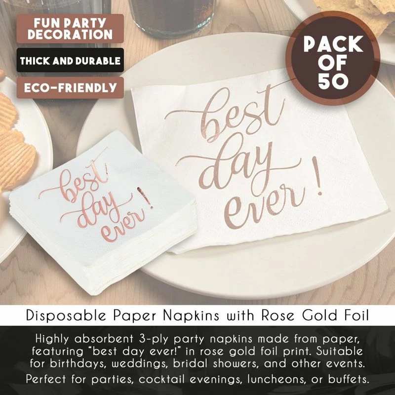Cocktail Napkins 50 Pack Luncheon Napkins, Disposable Paper Napkins Party Supplies, 3-Ply, Best Day Ever, Rose Gold Foil Print, Unfolded 10 x 10 inches, Folded 5 x 5 inches