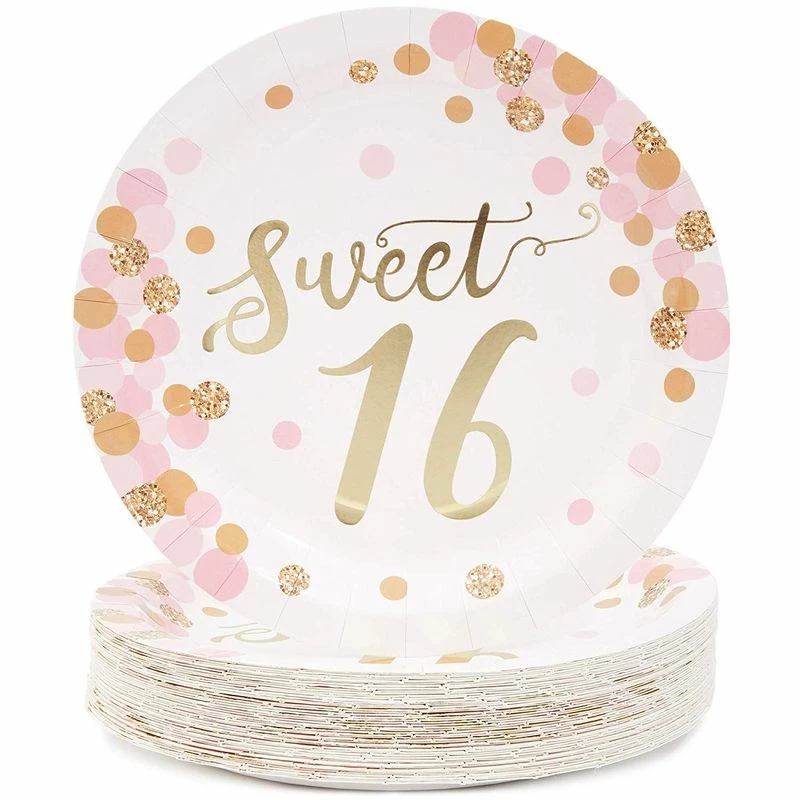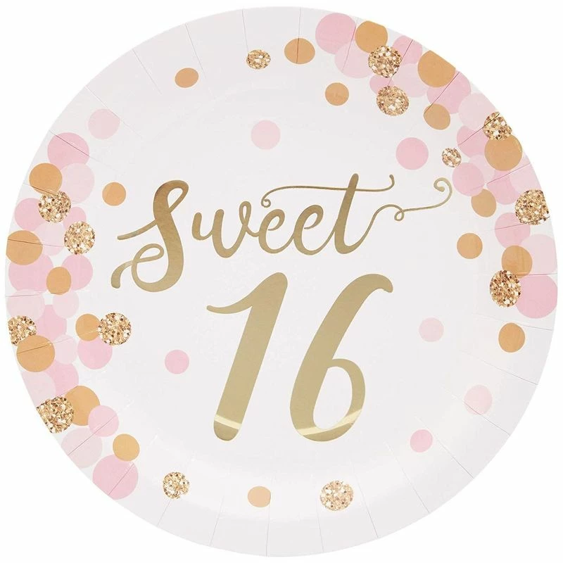 - 16TH BIRTHDAY PARTY DECORATIONS: The white and pink paper plates feature gold foil “Sweet 16” lettering in the center; ideal for creating a celebratory atmosphere and perfectly coordinated theme for your 16th birthday party
