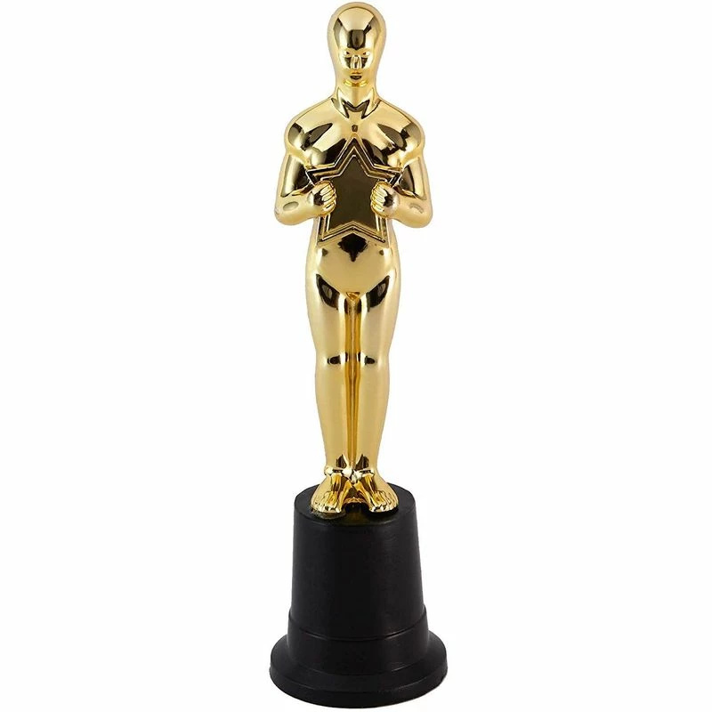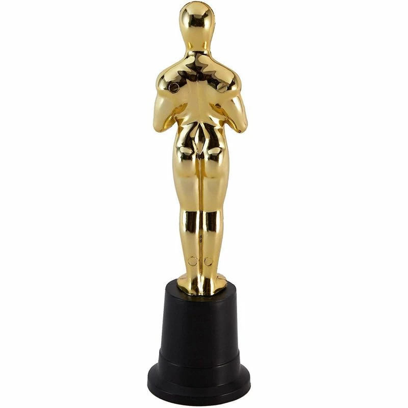 Pack of 4 golden award trophies on black plastic base. Black base can be personalized with receiver’s name using sticker labels (labels not included). Ideal for award ceremonies, parties, contests, celebrations, red carpet movie events, and more. Made of durable PP plastic material. Dimensions: 8.8 inches height, 2.3 inches base diameter